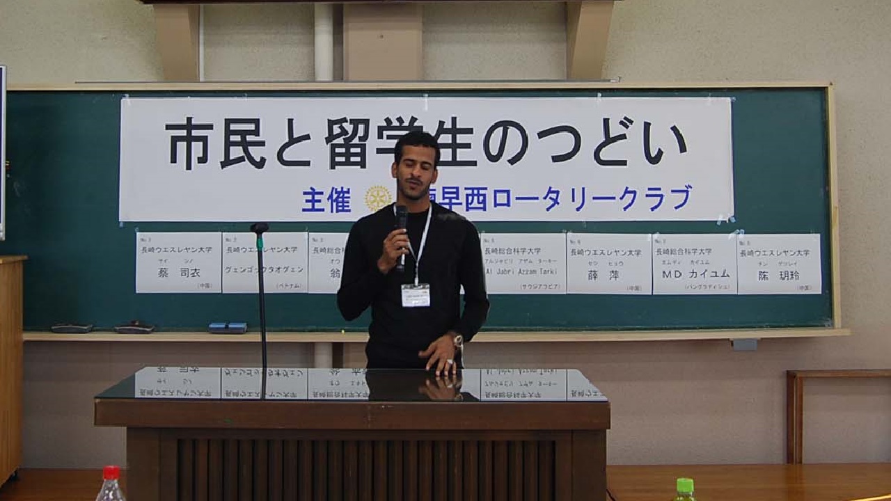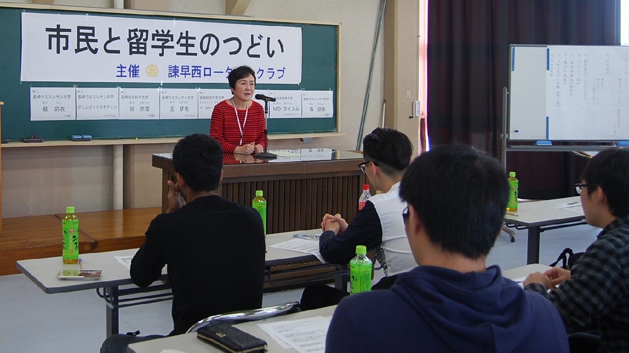 今年は2日間とも天気は晴天に恵まれました。1日目は千々石少年自然の家、研修室にて、留学生8名のスピーチコンテストを開催し、最優秀賞に総科大のMDカイユムさん(バングラディシュ)、RC会長賞にウエスレヤン大学のグェンゴックタオグェンさん(ベトナム)、いさはや国際交流センター賞にウエスレヤン大学のオウ ムギョウさん(中国)が入賞されました。素晴らしい語学力、表現力、内容でした。